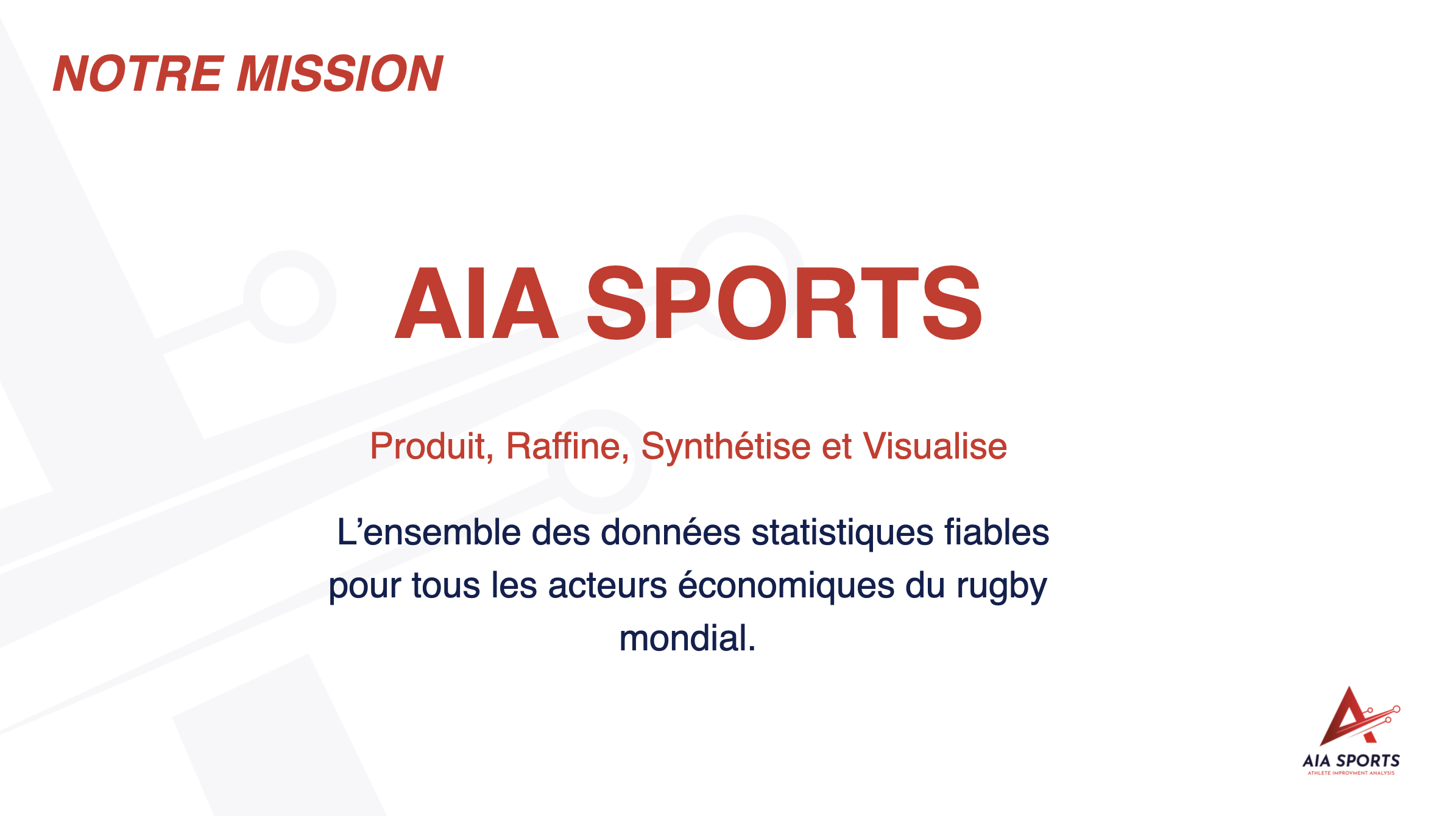 AIA SPORTS est une entreprise spécialisée dans la fourniture de statistiques pour les clubs professionnels, fédérations, médias, agents de joueurs et sociétés de paris sportifs.